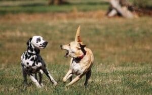 Kwispelt je labrador met zijn staart terwijl hij blaft of zakt hij door zijn voorpoten? Dan is hij enthousiast en wil hij graag met de andere hond spelen. Door te blaffen probeert hij de aandacht van de andere hond te trekken. Ga hier niet in mee, maar loop gewoon door. Jij bent immers degene die bepaalt wanneer je labrador met een andere hond mag spelen.